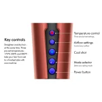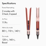 اتو مو فوق پیشرفته دایسون،حالت دهی فقط با باد گرم و سرد، بدون گرم شدن مستقیم صفحه های تیتانیومی برای جلوگیری از آسیب دیدن موها با توان ۱۶۰۰وات / قابل استفاده برای موهای مرطوب و خشک / درجه حرارت در سه حالت ۸۰، ۱۱۰، ۱۴۰ سانتیگراد قابل تنظیم برای موهای مرطوب / درجه حرارت در سه حالت ۱۲۰، ۱۴۰ سانتیگراد و حالت Boost قابل تنظیم برای موهای خشک / صفحه نمایش OLED / دارای دکمه باد سرد با دمای ۳۰ درجه/ برنده جایزه طراحی TIME’s ۲۰۲۳ / دارای برنامه تمیز کننده خودکار / دارای دو سرعت باد دهی دور ملایم و تند / سیستم قطع خودکار جریان باد بعد از ۳ ثانیه در صورت استفاده نشدن / دارای فیلتر مکش هوای قابل شستشو و جداسازی / قابلیت جداسازی و شستشوی نازل های باد / دارای تنظیمات تغییر زبان؛نمایش درجه حرارت به فارنهایت یا سلسیوس؛تنظیم مدت زمان خاموش شدن؛فعال سازی سیستم Self Cleaner؛ ریست و بازنشانی تنظیمات کارخانه / دارای کلید قفل صفحات / خاموش شدن کامل دستگاه بعد از ۳ دقیقه استفاده نشدن(قرار گیری در حالت افقی بدون جا به جا شدن) دارای صفحه نمایش،سیستم یون ساز، سیستم خاموشی خودکار، دکمه روشن/خاموش، دسته ارگونومیک، تقویت کننده توربو / قابلیت قفل کردن انبر برای استفاده به عنوان سشوار / تشخیص خودکار مو و تنظیم شدت باد / صاف کردن مو با هوای گرم / عملکرد مشابه اتو مو بدون صفحات داغ
